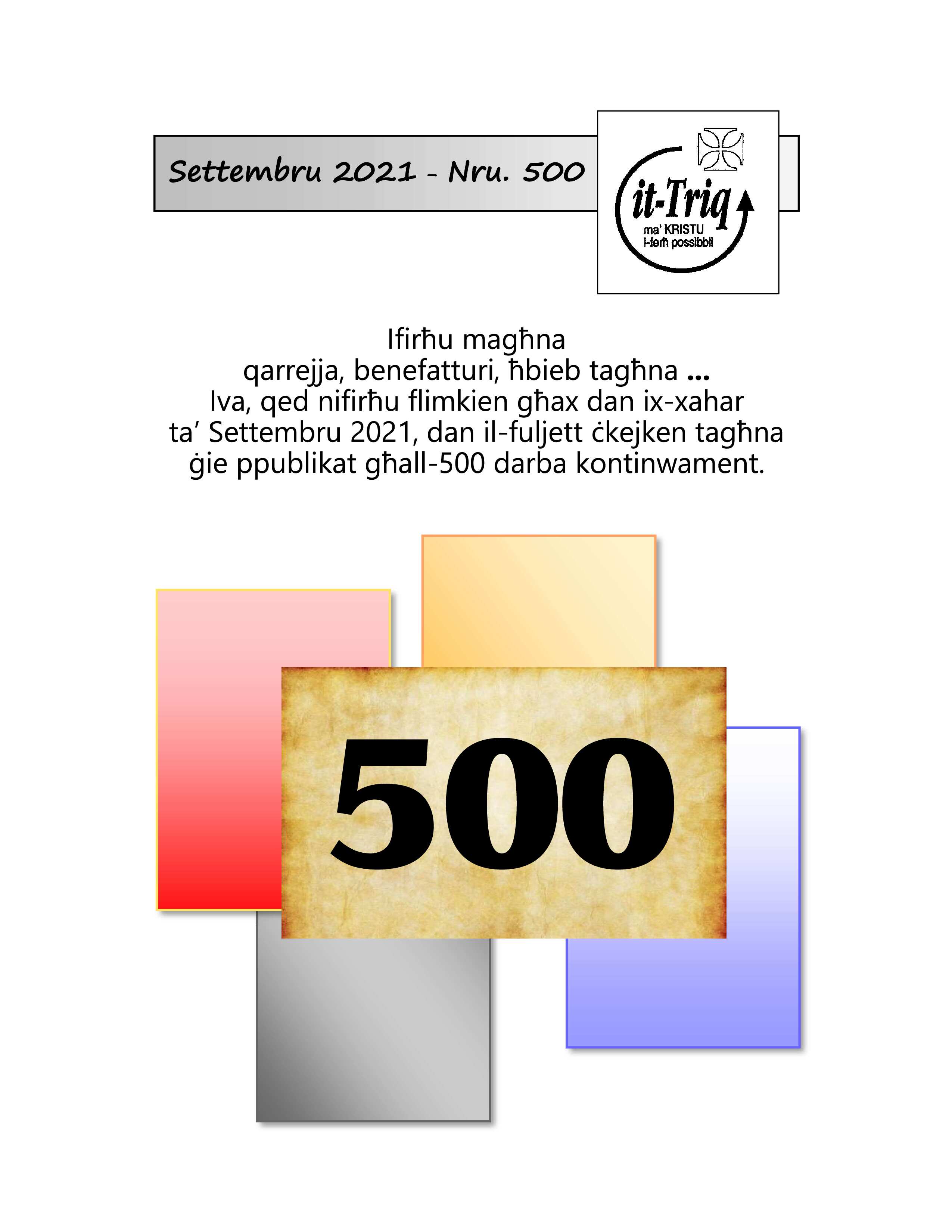L-abbonament huwa b’xejn. Kull kontribuzzjoni volontarja hi ferm apprezzata. (Min jixtieq jibgħat ċekk b'donazzjoni għandu jindirizzah Prayer Group It-Triq. Infakkru li skont direttiva tal-Bank Ċentrali ta' Malta Nru.19 tal-2021 ċekkijiet bil-valur ta' €20 jew anqas ma jkunux jistgħu jissarfu.)